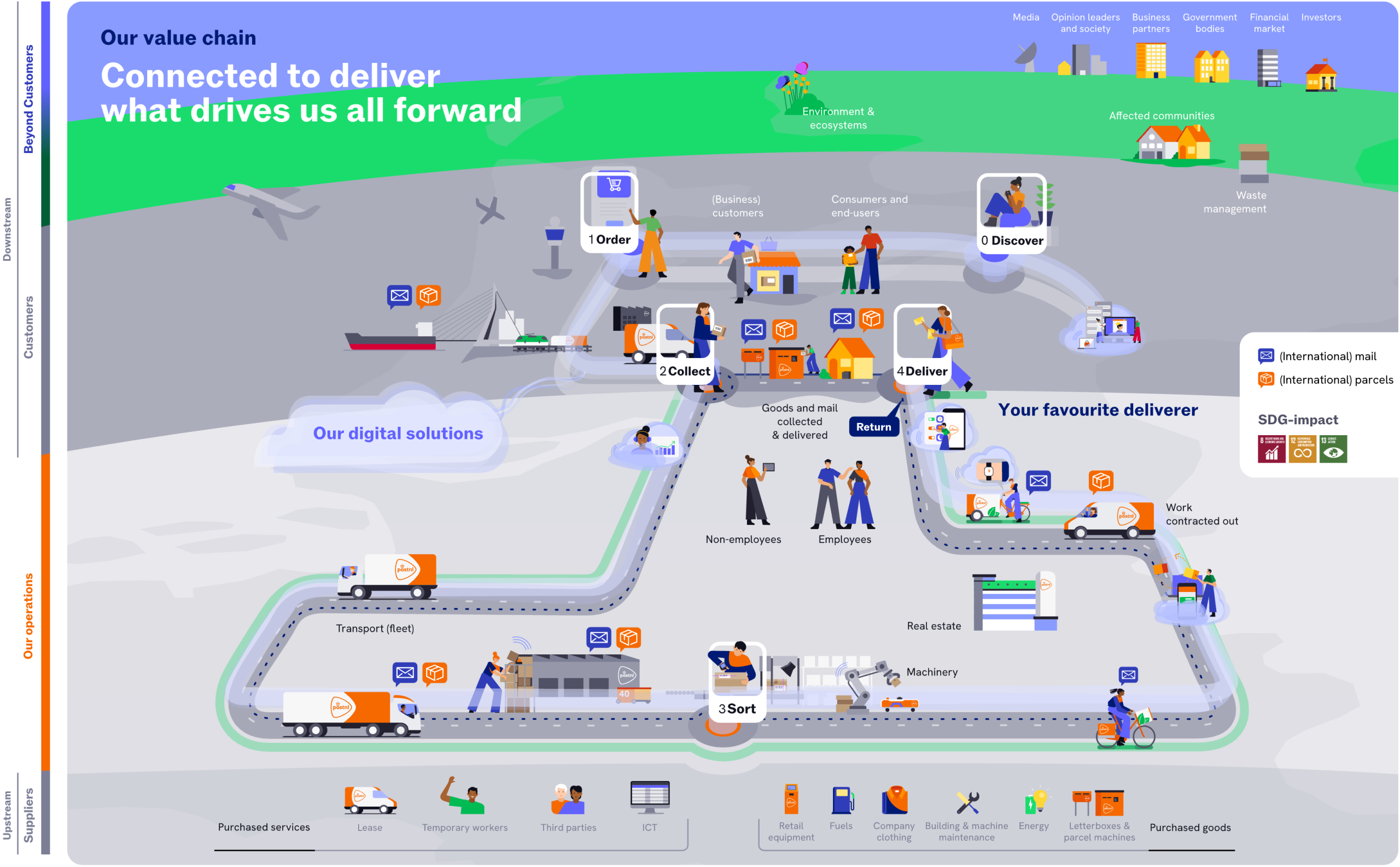 As outlined in Our strategy chapter later in the report, we have introduced a new purpose to better reflect the role we play in a rapidly evolving logistical and societal landscape. This purpose – Connected to deliver what drives us all forward – is reflected in the attention we place on every phase of the value chain. We tailor our services to evolving customer and consumer needs throughout the process, which begins with discovery and order, followed by our three core logistics activities: collect, sort, and deliver.