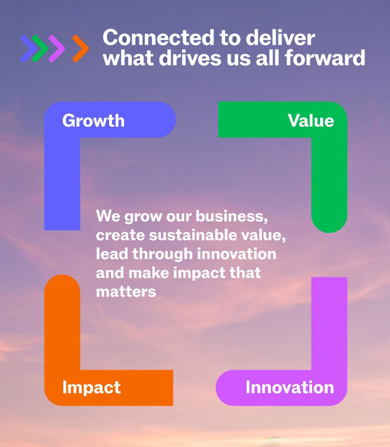 From our purpose flows a clear sense of what matters most. To deliver on our North Star and the role we play in society, we focus on four pillars that define how we create long-term value: Growth, Value, Innovation, and Impact. These pillars express what it means to be Connected to deliver what drives us all forward, sharing how we make decisions, how we invest, and how we measure success.