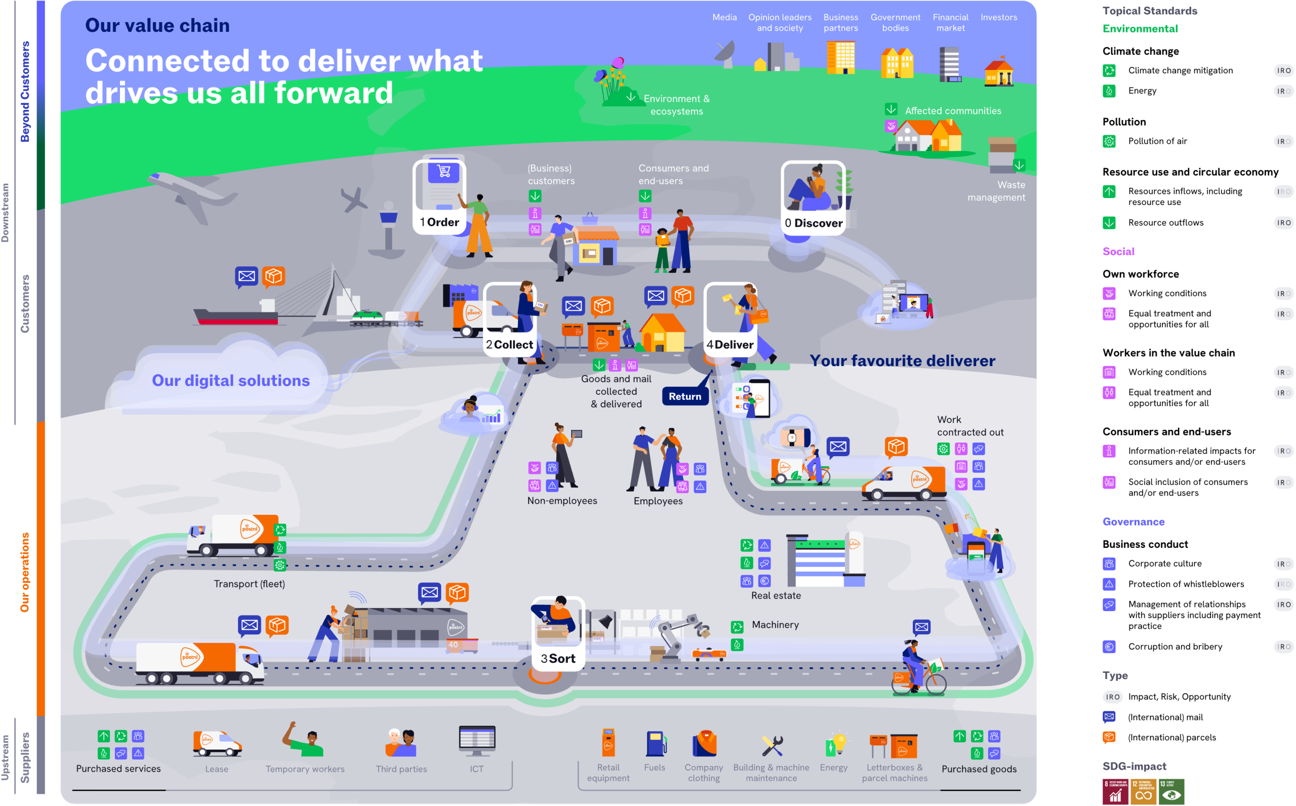 The context in which we operate, including our position and role within the value chain, market developments, and engagement with stakeholders such as shareholders, customers, employees, delivery partners and suppliers, is illustrated in Our value chain infographic on the next page. The infographic provides an overview of the logistics process, shows how we connect with business customers, consumers, and end-users, and highlights the Corporate Sustainability Reporting Directive (CSRD) topical standards most relevant to our operations and stakeholders.